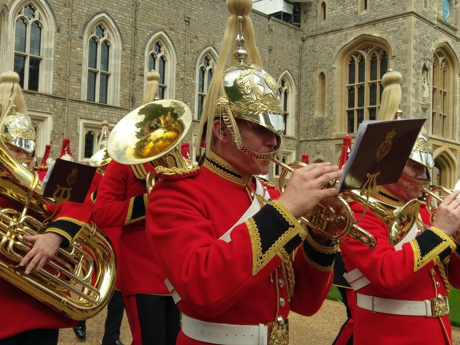 I was going through some old photos and this one of a brass band caught my eye. I think with our gloomy grey skies I find anything red attracts me at the moment. The setting is Windsor Castle, and the pomp and ceremony when my son was invested as a Queen’s Scout. The honour was his, not mine, although I admit to being an enormously proud mum.